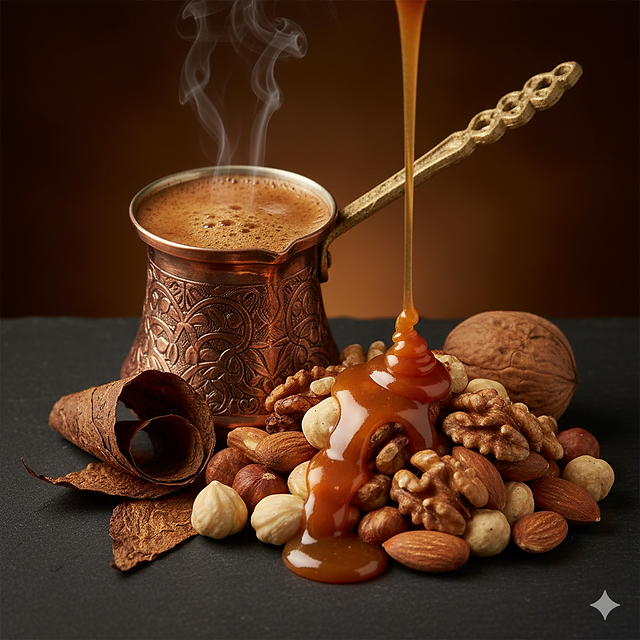 مزيج راقي بيجمع بين دفء التوباكو ونكهة القهوة التركي الغنية، مع لمسة كراميل سايحة ومكسرات محمصة بتدي قرمشة خفيفة. أول نفس فيه مرارة خفيفة من القهوة والتبغ، بعدها الحلاوة الدافية للكراميل بتوازن الطعم، والمكسرات بتختم الإحساس بنكهات غنية وواقعية. نكهة فيها عمق ورجولة ودفء كأنك قاعد في قهوة كلاسيك وريحة القهوة والكراميل ماليه المكان.